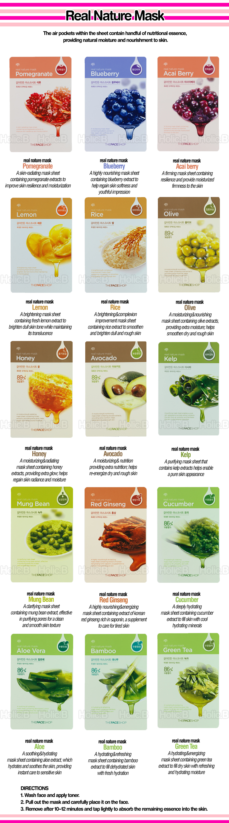 As I mentioned before, one of my favorite brands is The Face Shop Real Nature Mask because of its price, quality and variety of choices. You can easily find them online, but if you’re in the Chicago area, please go to The Face Shop located in Hmart in Niles, Illinois. They’re $2 each there, and if you buy 7, you get one free (at least they had the deal last couple times I was there). They have all the varieties available to address any type of skin concern!